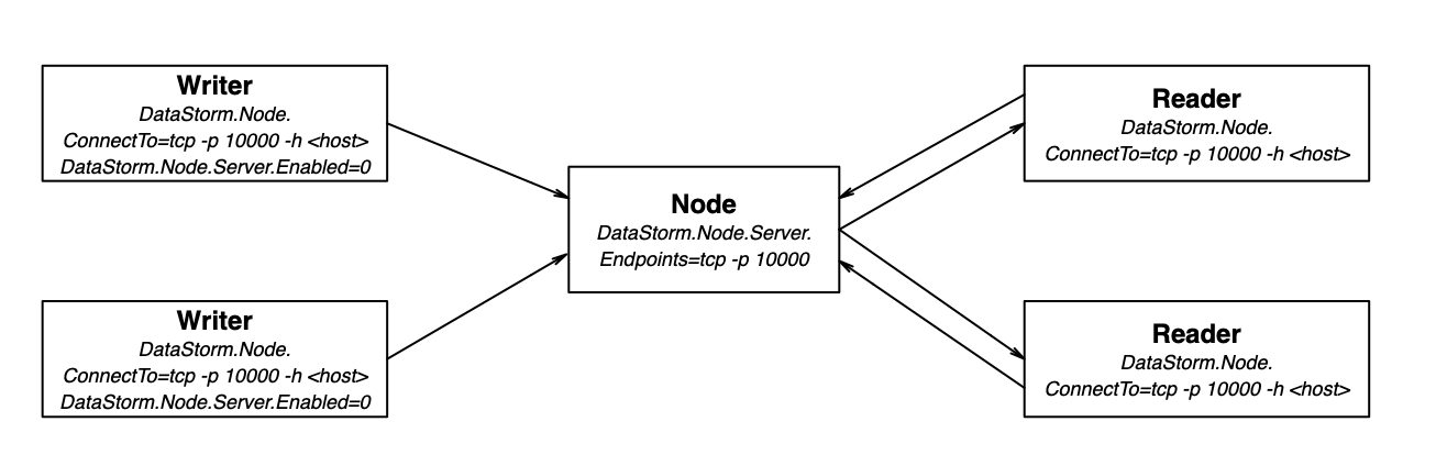 A DataStorm node connects to other nodes to exchange data and to discover other nodes. Discovery can either use UDP multicast or TCP. Data exchange is only performed through TCP connections between nodes. The endpoint for both TCP and multicast are configurable with the DataStorm.Node.Server.Endpoints and DataStorm.Node.Multicast.Endpoints properties. We'll discuss here the different network deployments which are possible with DataStorm.