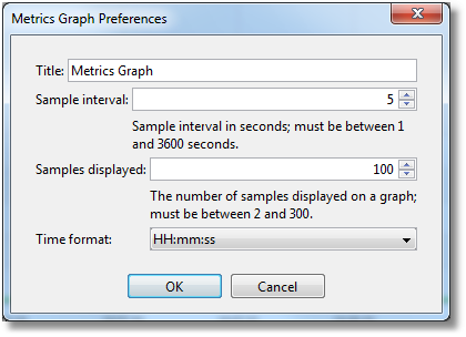 The File > Preferences menu of a Metrics Graph window opens a dialog that allows you to configure several properties of your Metrics Graph: