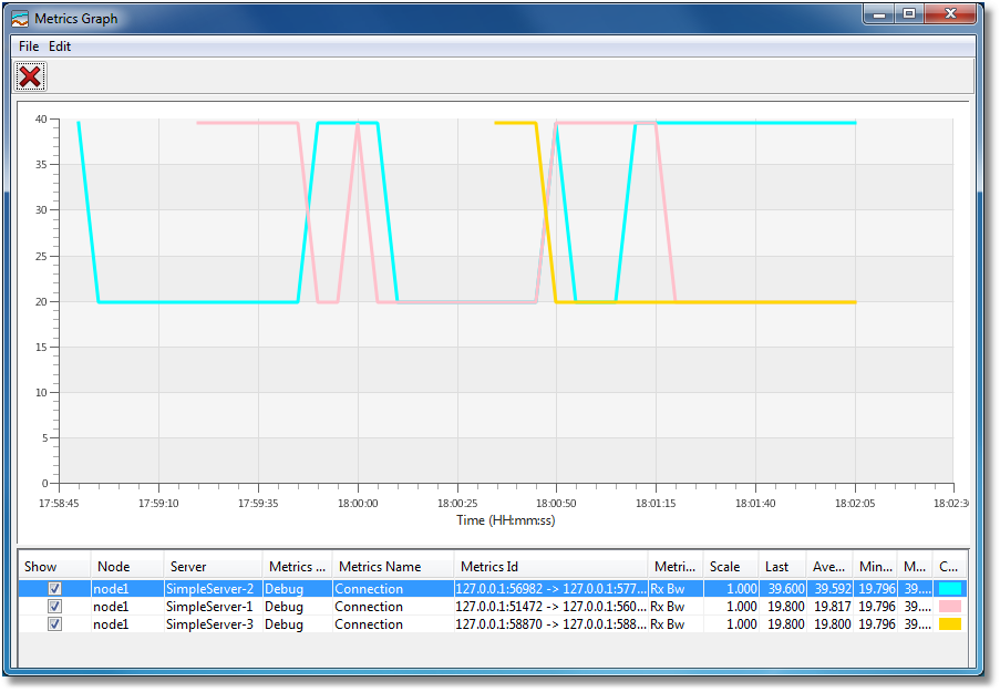 For each metric plotted in a Metrics Graph, IceGrid Admin retrieves the corresponding value every Sample interval seconds (by default every 5 seconds), and displays n values (n = 120 by default). Sample interval times Samples displayed correspond to the time period represented on a graph; by default, it is 5s * 120 = 10 minutes.