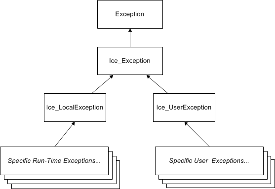 The ancestor of all exceptions is Exception, from which Ice_Exception is derived. Ice_LocalException and Ice_UserException are derived from Ice_Exception and form the base for all run-time and user exceptions.