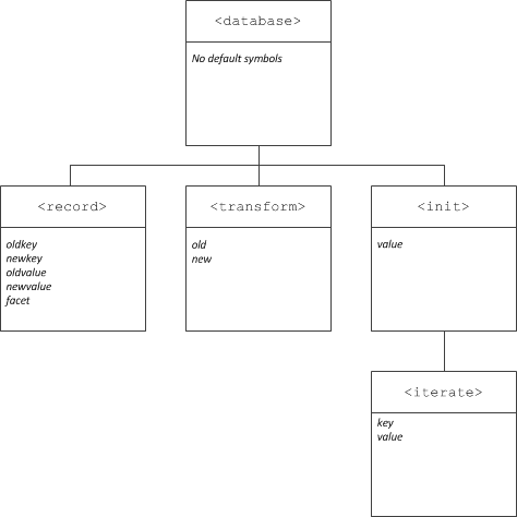 In addition to symbols in the <iterate> scope, child descriptors of <iterate> can also refer to symbols from the <init> and <database> scopes.