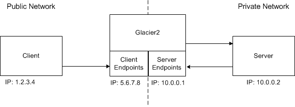 Glacier2 normally runs on a host in the private network behind a port-forwarding firewall, but it can also operate on a host with access to both public and private networks. In this configuration it follows that Glacier2 must have endpoints on each network.