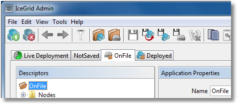 - An icon-less tab displays the definitions of an application that is not bound to an IceGrid registry or to a file, such as a brand new application. A live application with unsaved modifications also becomes icon-less if the connection to its IceGrid registry is lost.