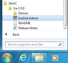 On Windows IceGrid Admin can be started by clicking the IceGrid Admin icon in the Start menu: