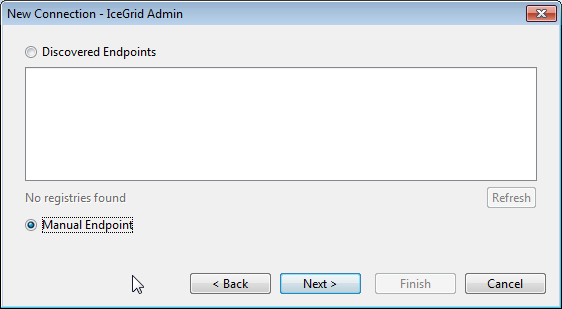 As of Ice 3.6, IceGrid Admin can also discover registries using UDP multicast. Any registries it finds will be shown in the list, or click the Refresh button to search again.