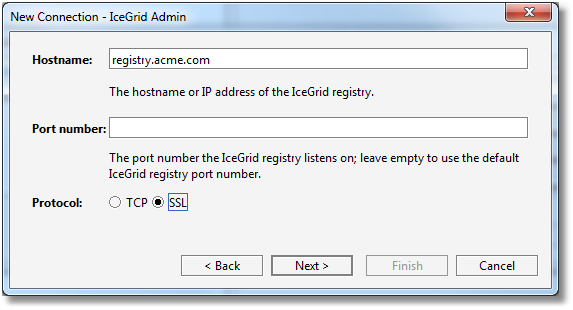 Step 5: Enter the hostname of the IceGrid registry, leave the port number empty to use the default IceGrid port number (4061 for TCP and 4062 for SSL), and select SSL for the protocol: