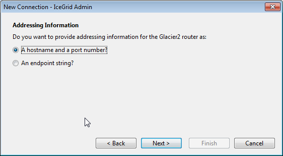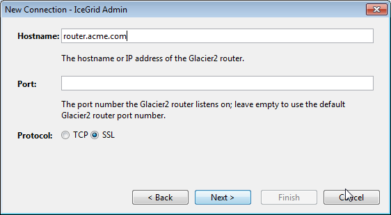 Step 2: Enter the addressing information for the target Glacier2 router as a hostname and port number: