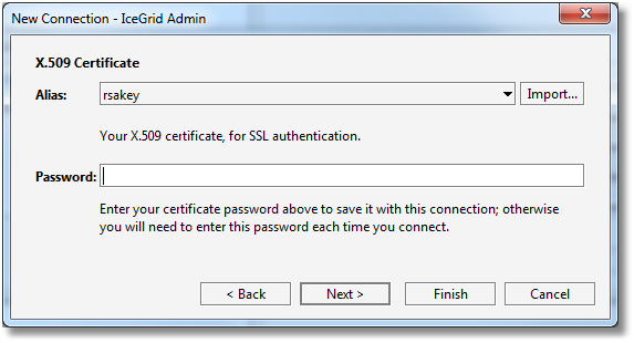 Step 9: Click Finish to save the connection and connect to the IceGrid registry. Unless we entered (and therefore saved) the X.509 key password with the connection, we are prompted for this password: