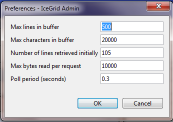 The maximum number of bytes retrieve by each request. Pick a value that is low enough to make the dialog appear responsive and big enough to avoid many round-trips when lots of data are logged. IceGrid Admin requires a value between 100 and Ice.MessageSizeMax - 512. - Poll period