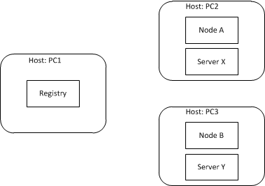 As an example, this illustration shows a very simple IceGrid application running on a network of three computers. The IceGrid registry is the only process of interest on host PC1, while IceGrid nodes are running on the hosts PC2 and PC3. In this sample application, one server has been assigned to each node.