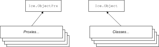 Like interfaces, classes implicitly inherit from a common base class, Ice.Object. However, as shown in the illustration below, classes inherit from Ice.Object instead of Ice.ObjectPrx (which is at the base of the inheritance hierarchy for proxies). As a result, you cannot pass a class where a proxy is expected (and vice versa) because the base types for classes and proxies are not compatible.