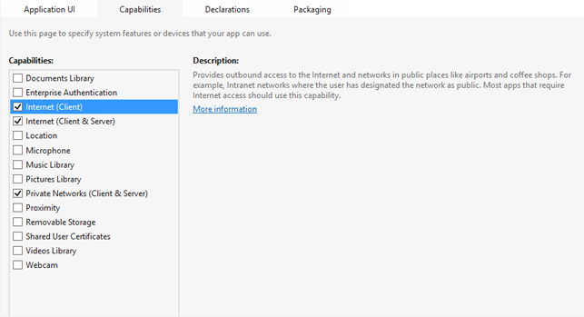 Neglecting to enable the proper capabilities can raise Ice::SocketException or, if you are debugging the application in Visual Studio at the time of the exception, it will likely break on Platform::AccessDeniedException.