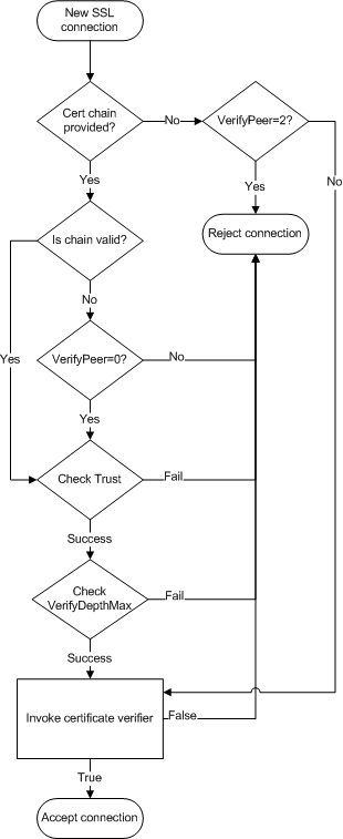 A new connection undergoes a series of verification steps before an application is allowed to use it. The low-level SSL engine executes certificate validation procedures and, assuming the certificate chain is successfully validated, IceSSL performs additional verification as directed by its configuration properties. If a certificate verifier is installed, IceSSL invokes it to provide the application with an opportunity to decide whether to accept or reject the connection. The value of the IceSSL.VerifyPeer property also plays an important role here. We've summarized the process in the following flow chart: