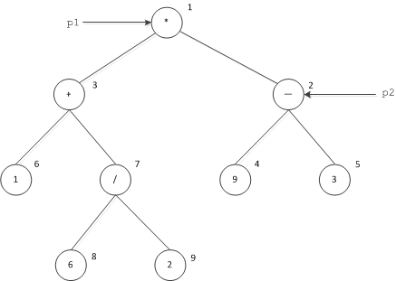 Expression tree for the expression (1 + 6 / 2) * (9 - 3). Both p1 and p2 denote the root node.
