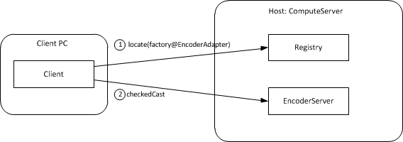 The client's call to checkedCast is the first remote invocation on the factory object, and therefore the locate request is performed during the completion of this invocation. The subsequent call to createEncoder is sent directly to the server without further involvement by IceGrid.