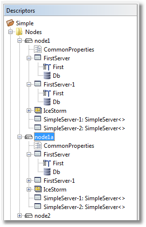 Most descriptor sub-trees can be copied and later pasted. Copies are always deep-copies: for example if you copy a node, all the servers on this code are copied, including all the the sub-elements of these servers (object adapters, database environment, services, etc.).