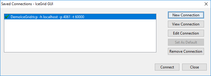 Double-click on the IceGrid registry you want to connect to, or select the IceGrid registry and click on the Connect button.
