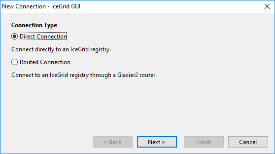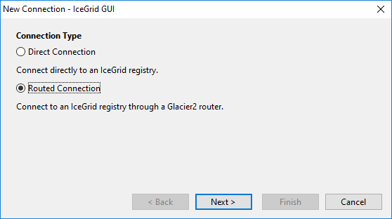 Step 6: Click Finish to save the connection; IceGrid GUI then attempts to connect to the IceGrid registry through the Glacier2 router.