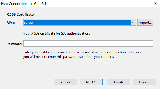 Step 9: Click Finish to save the connection and connect to the IceGrid registry. Unless we entered (and therefore saved) the X.509 key password with the connection, we are prompted for this password:
