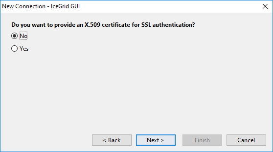 A "client" X.509 certificate (saved in My Certificates) is only necessary when the target IceGrid registry or Glacier2 router requires one. This depends on the setting of the IceSSL.VerifyPeer property in those servers: when IceSSL.VerifyPeer is 2, IceGrid GUI must provide a valid certificate. If you forget to provide a certificate, or provide an invalid certificate, the connection establishment will fail and you will get an error dialog such as: