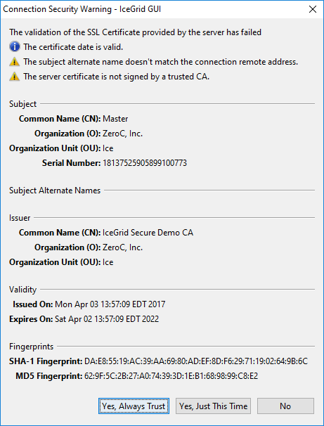 If you selectYes, Always Trust, the certificate is added in the persistent Server Certificates set.