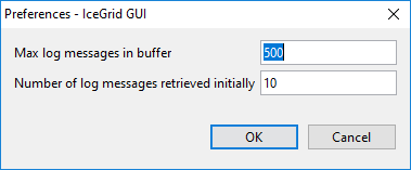 The Ice Log dialog shows the Ice log messages of a server, service, node or registry retrieved through IceGrid. The monitored Ice application sends these log messages to a remote logger implemented by the Ice Log dialog.