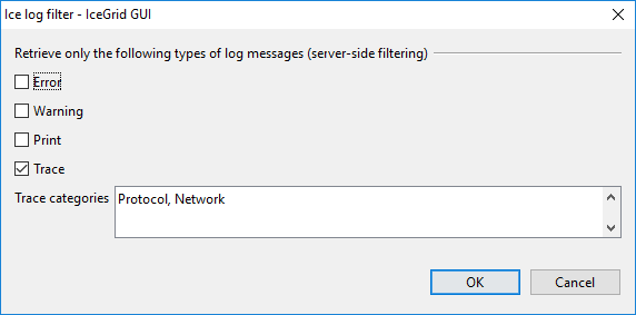This dialog allows you to filter the log messages sent by the monitored Ice applications. All the filtering is done in this remote Ice application.