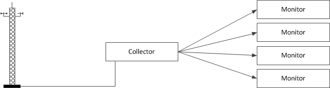 However, the primary disadvantage of this architecture is that it tightly couples the collector to its monitors, needlessly complicating the collector implementation by requiring it to manage the details of monitor registration, measurement delivery, and error recovery. We can rid ourselves of these mundane duties by incorporating IceStorm into our architecture, as shown below: