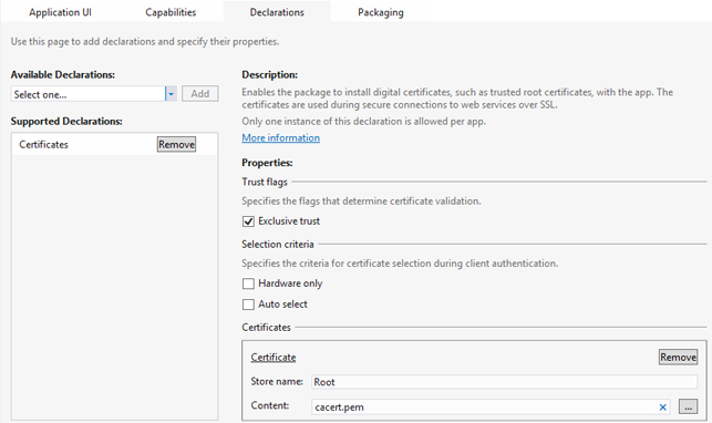 If your client application uses SSL, you can bundle certificates with the application by including them in the application's declarations: