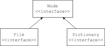 Given the very simple requirements we just outlined, we can start designing interfaces for the system. Files and directories have something in common: they have a name and both files and directories can be contained in directories. This suggests a design that uses a base type that provides the common functionality, and derived types that provide the functionality specific to directories and files, as shown:
