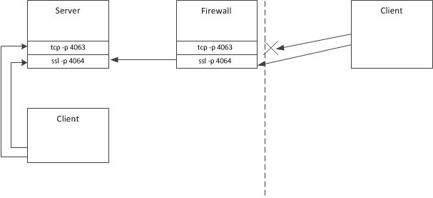 The firewall in the illustration is configured to block external access to TCP port 4063 and to forward connections to port 4064 to the server machine.