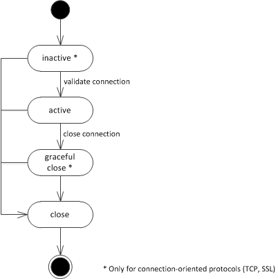 To summarize, a new connection is inactive until a validate connection message has been received by the client, at which point the active state is entered. The connection remains in the active state until it is shut down, which can occur when there are no more proxies using the connection, or after the connection has been idle for a while. At this point, the connection is gracefully closed, meaning that a close connection message is sent, and the connection is closed.