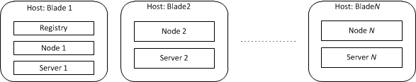 IceGrid's flexibility allows an endless variety of configurations. For example, suppose we have a grid network and want to replicate a server on each blade, as shown below: