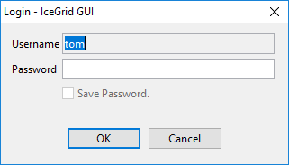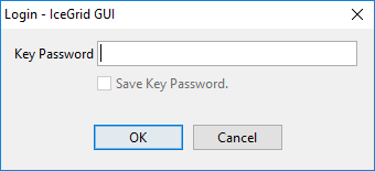 If the connection contains saved credentials, IceGrid GUI will immediately attempt to connect to the selected IceGrid registry with these credentials. Otherwise, it will open a new dialog to request the missing password (two passwords in some cases), such as: