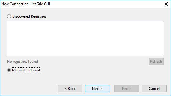 As of Ice 3.6, IceGrid GUI can also discover registries using UDP multicast. Any registries it finds will be shown in the list, or click the Refresh button to search again.