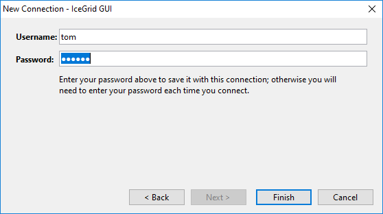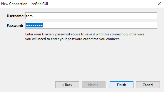 Step 6: Click Finish to save the connection; IceGrid GUI then attempts to connect to the IceGrid registry through the Glacier2 router.