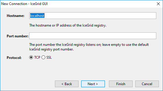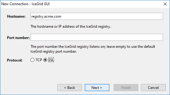 Step 5: Enter the hostname of the IceGrid registry, leave the port number empty to use the default IceGrid port number (4061 for TCP and 4062 for SSL), and select SSL for the protocol: