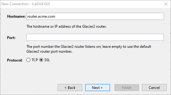 Step 3: Enter the hostname of the Glacier2 router, leave the port number empty to use the default Glacier2 port number (4063 for TCP and 4064 for SSL), and select SSL for the protocol: