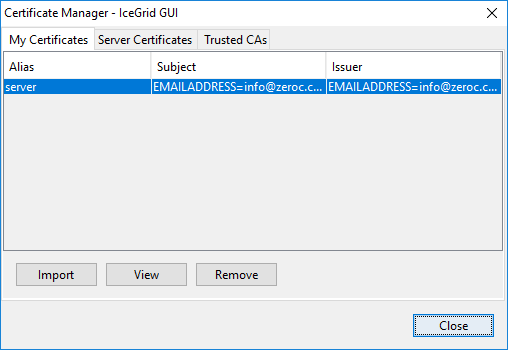 IceGrid GUI maintains a persistent store of X.509 certificates for SSL connections with IceGrid registries. You can import, view and remove these certificates with the Certificate Manager. Use File > Certificate Manager... or click on the Import... button in the Connection wizard to open the Certificate Manager:
