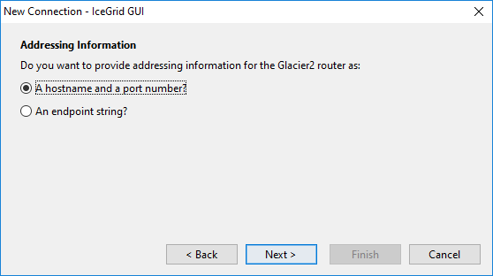 Step 2: Enter the addressing information for the target Glacier2 router as a hostname and port number: