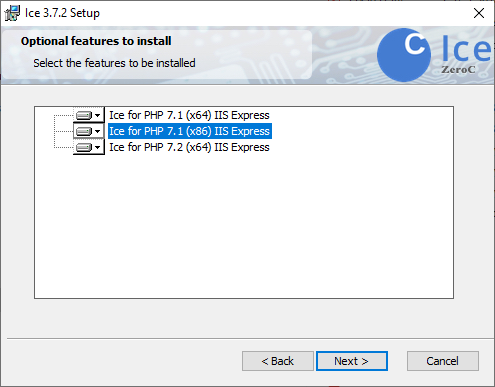 The MSI distribution includes all the components required to develop Ice for PHP applications on Windows, including PHP and Slice source files, the slice2php compiler and the Ice for PHP extension. The MSI installer detects the PHP installations on your computer and allows you to select where to install the Ice for PHP extension: