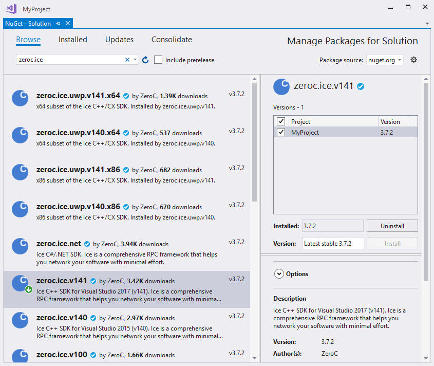 - Several NuGet packages: zeroc.ice.v100, zeroc.ice.v120, zeroc.ice.v140, zeroc.ice.v141, zeroc.ice.uwp.v140, zeroc.ice.uwp.v141 and zeroc.ice.net