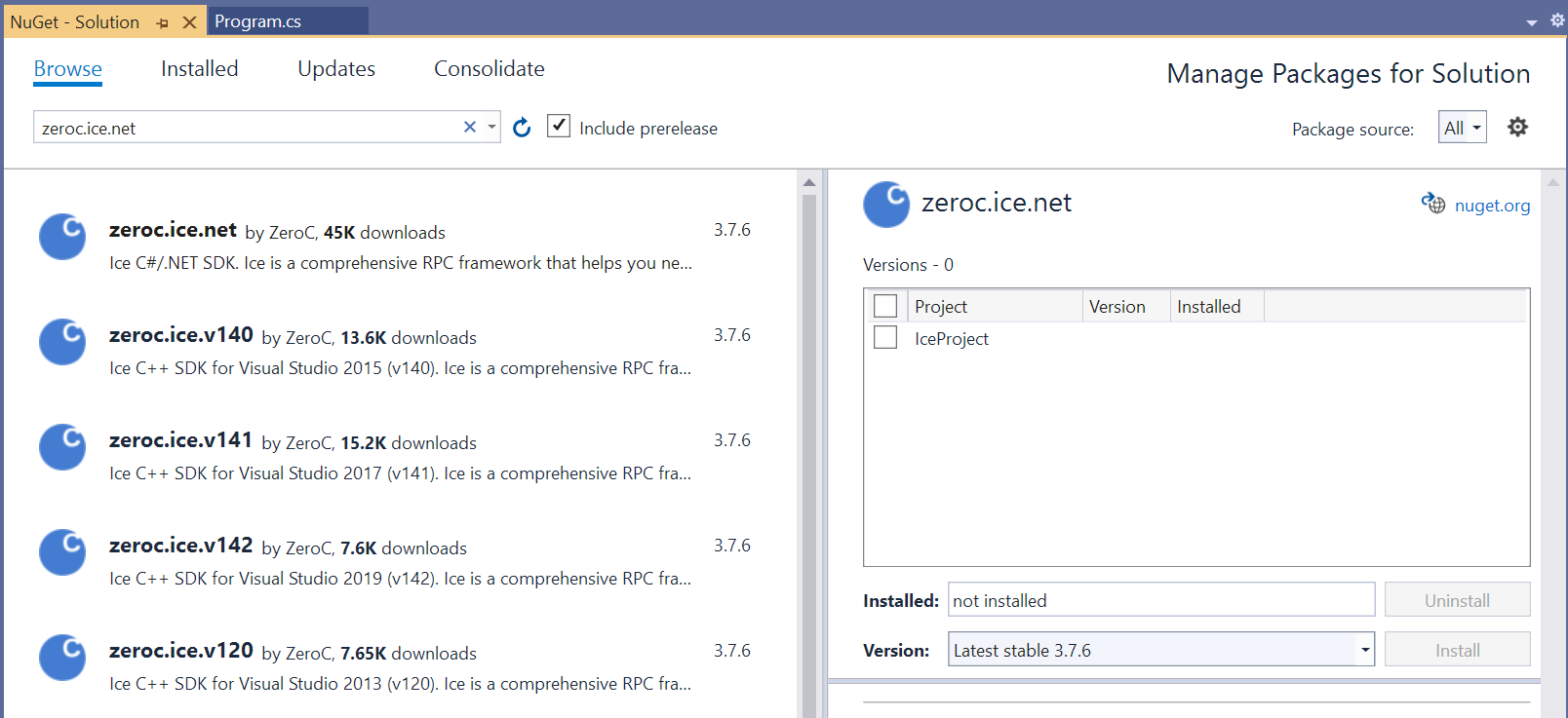 - Several NuGet packages: zeroc.ice.v100, zeroc.ice.v120, zeroc.ice.v140, zeroc.ice.v141, zeroc.ice.v142 and zeroc.ice.net