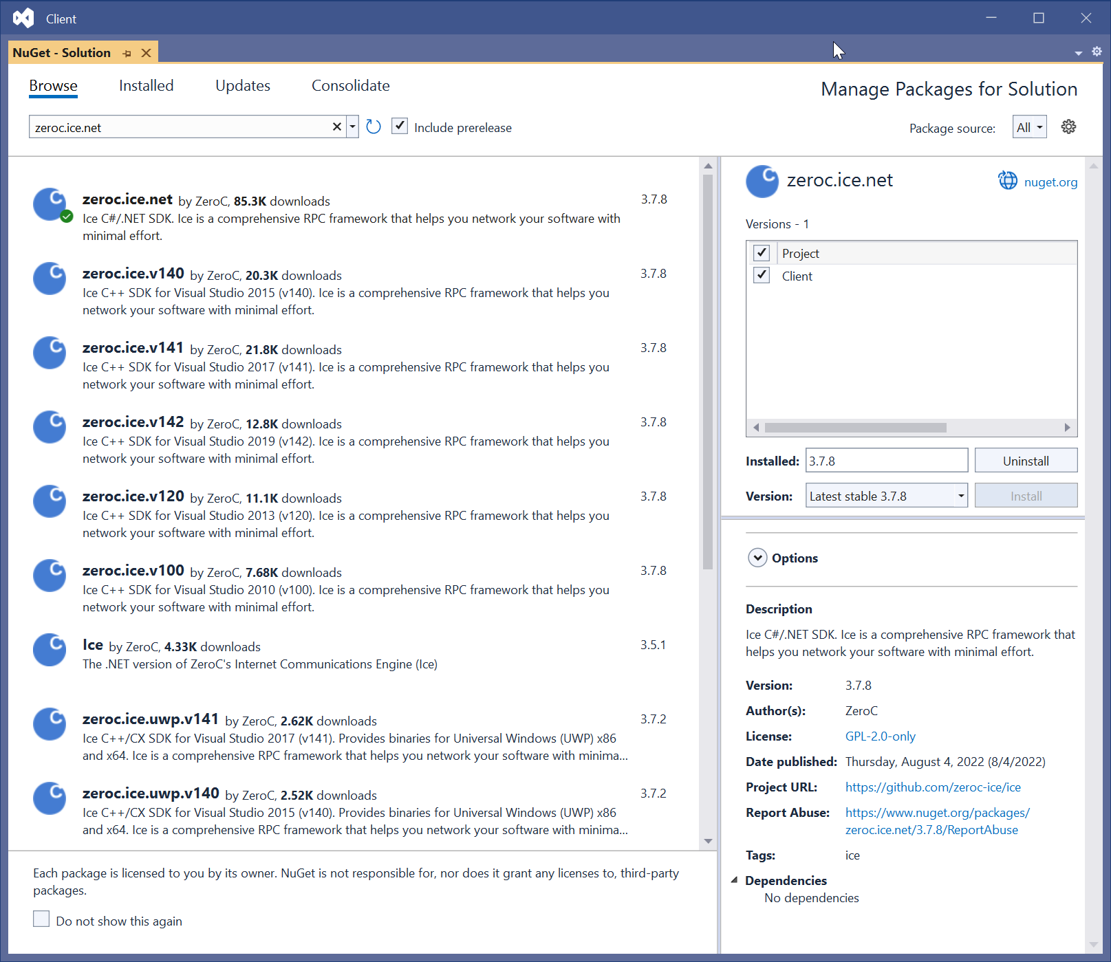 - Several NuGet packages: zeroc.ice.v100, zeroc.ice.v120, zeroc.ice.v140, zeroc.ice.v141, zeroc.ice.v142, zeroc.ice.v143 and zeroc.ice.net